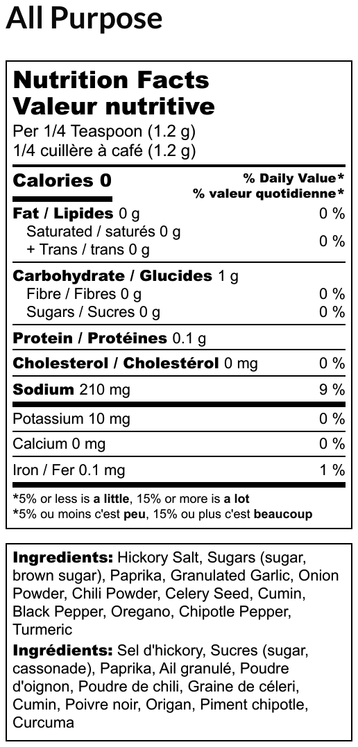 Ingredients: Chili Powder, Paprika, Hickory Salt, Garlic, Celery Seed, Cumin, Oregano, Black Pepper, Chipotle, Sugar, Granulated Onion, Turmeric, Brownulated Sugar.