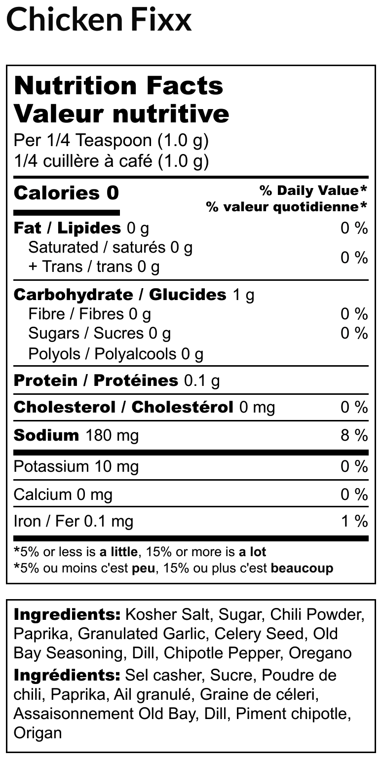 Ingredients: Poudre de chili, paprika, poudre d'ail, sel casher, graines de céleri, aneth, origan, vieille baie, sucre, chipotle