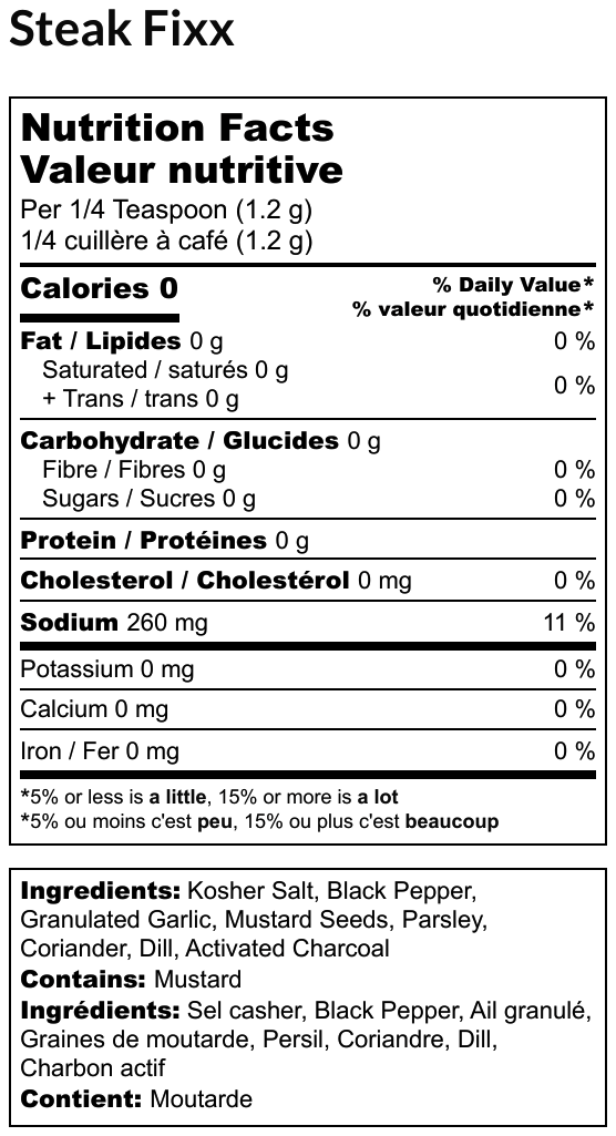 Ingredients: Coarse Black pepper, Kosher Salt, Garlic, Mustard Seed, Parsley, Dill, Coriander, Activated Charcoal